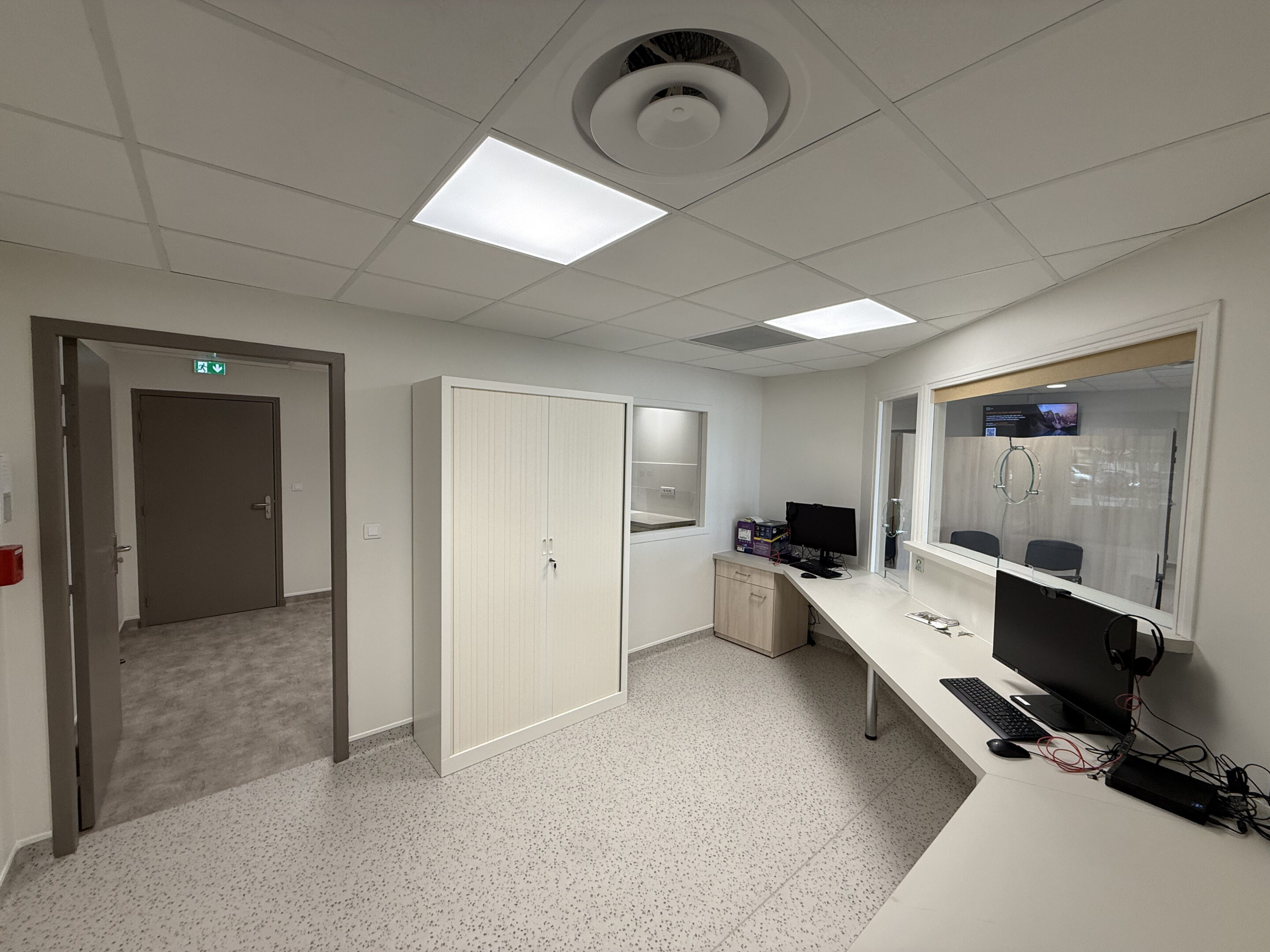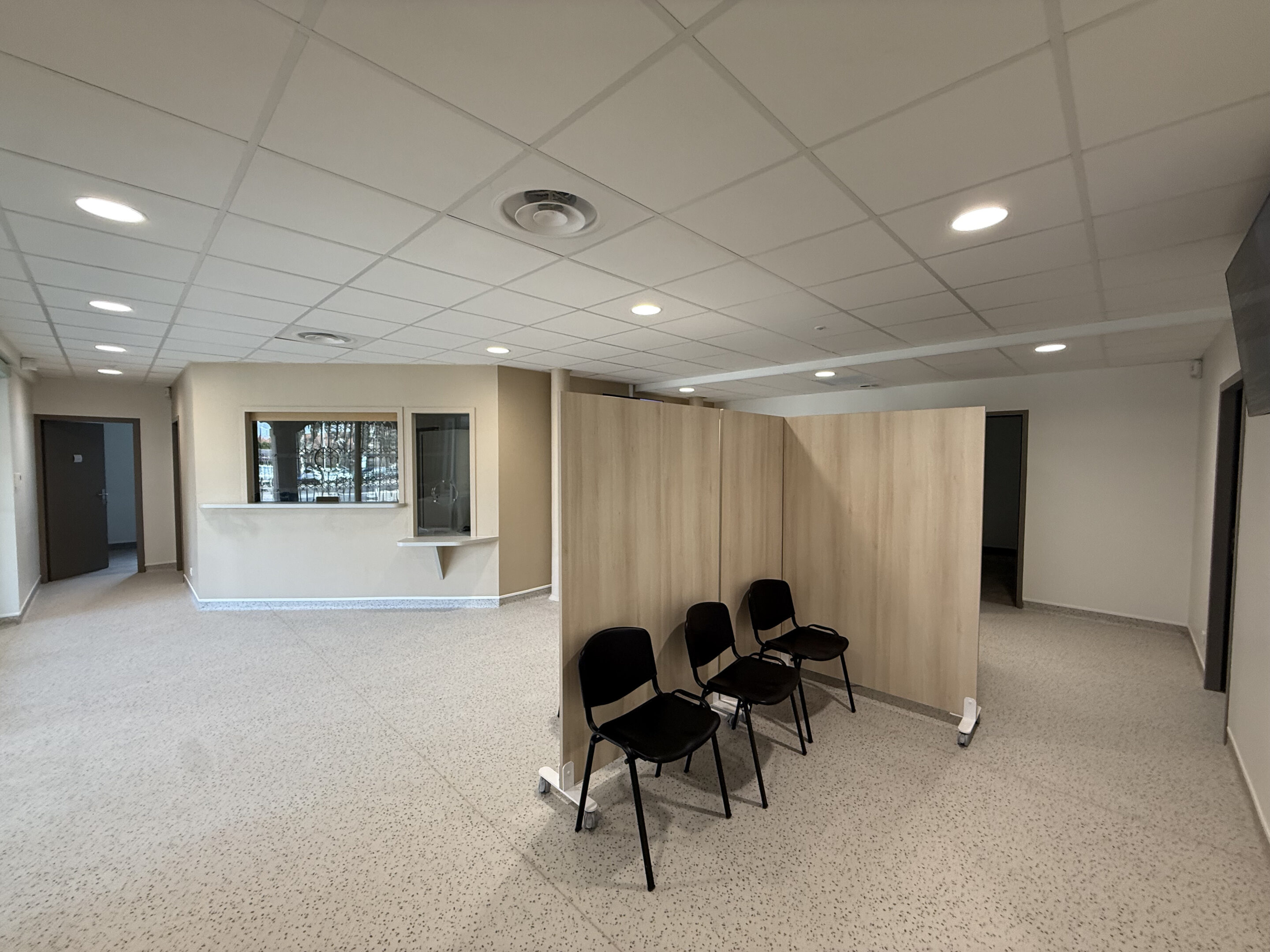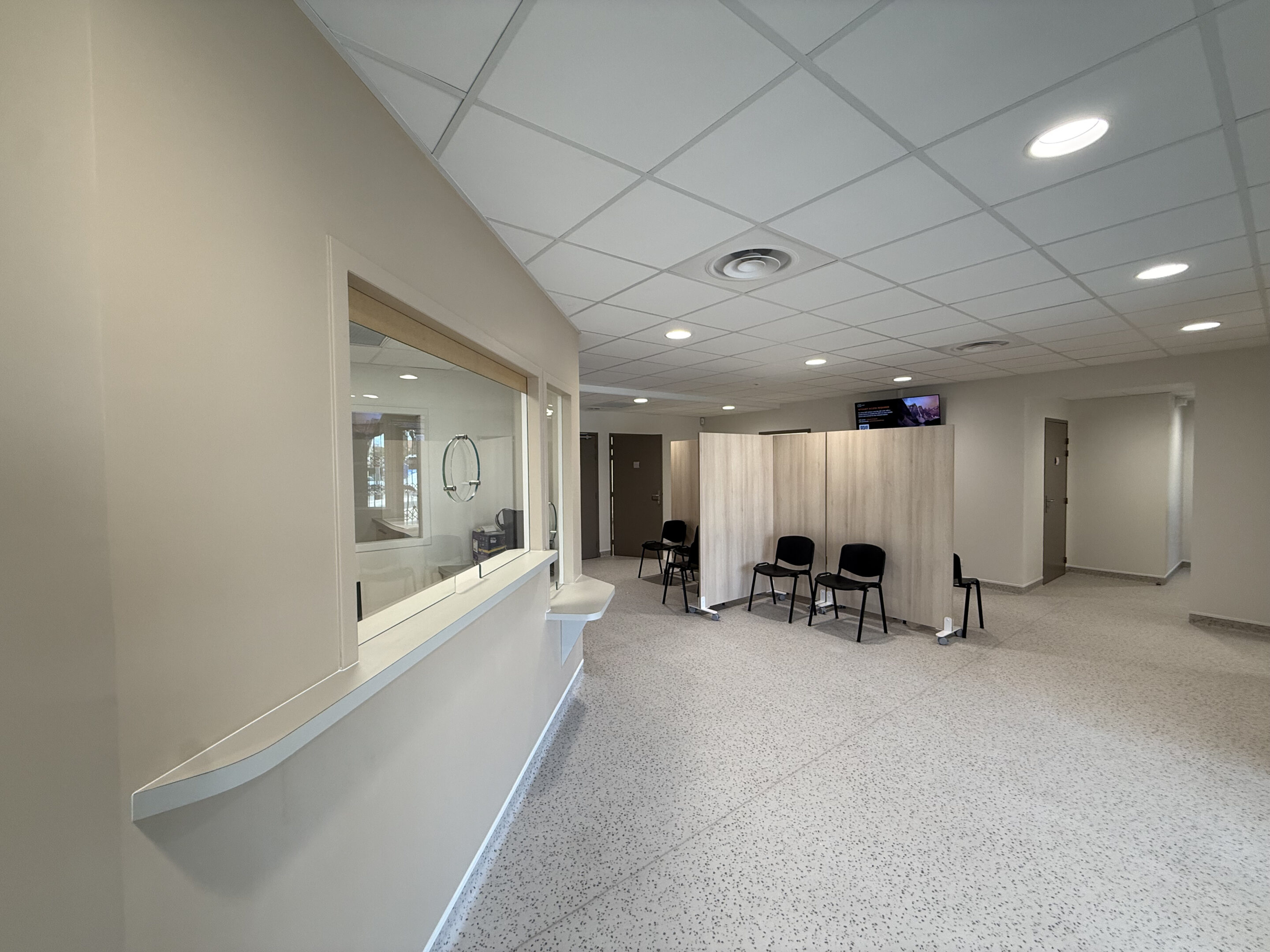 Pensé comme un lieu d’orientation et de transition, il organise l’ensemble des circulations vers les cabients médicaux. L’accueil administratif est conçu comme un espace identifié et fonctionnel, en relation directe avec une zone d’attente.